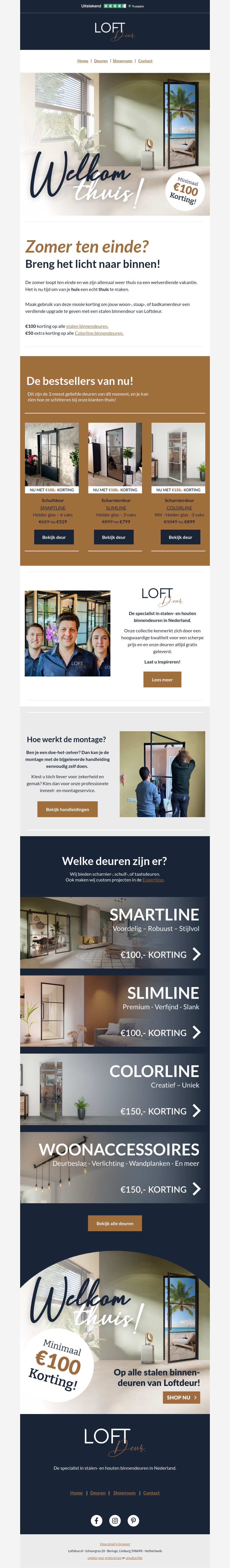 De zomer loopt ten einde, maar het licht kan naar binnen blijven stromen met onze stijlvolle stalen binnendeuren van Loftdeur. Ontdek de Smartline, Slimline en Colorline series, nu met kortingen tot €150. Mis deze kans niet om je interieur te verfraaien!