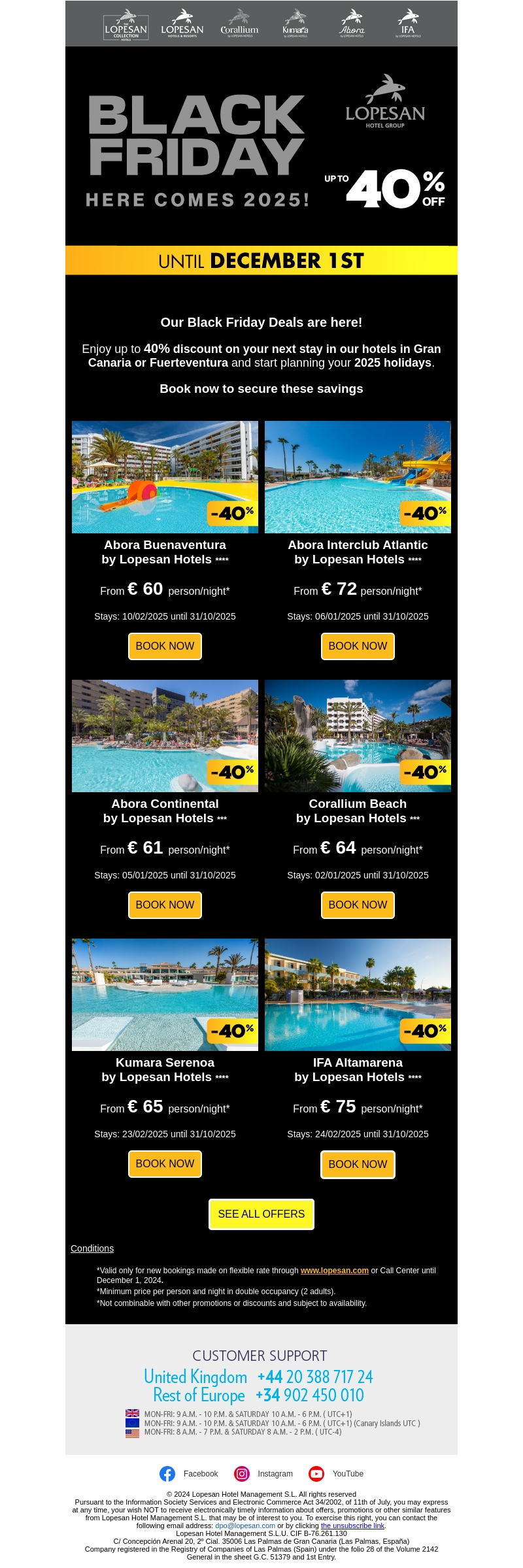 Geniet van spectaculaire Black Friday kortingen bij Lopesan Hotels en Resorts. Bespaar tot 40% op uw volgende verblijf op de prachtige eilanden Gran Canaria of Fuerteventura. Maak nu uw boeking en begin alvast met het plannen van uw vakantie voor 2025. Bekijk de beschikbare aanbiedingen en mis deze kans niet!