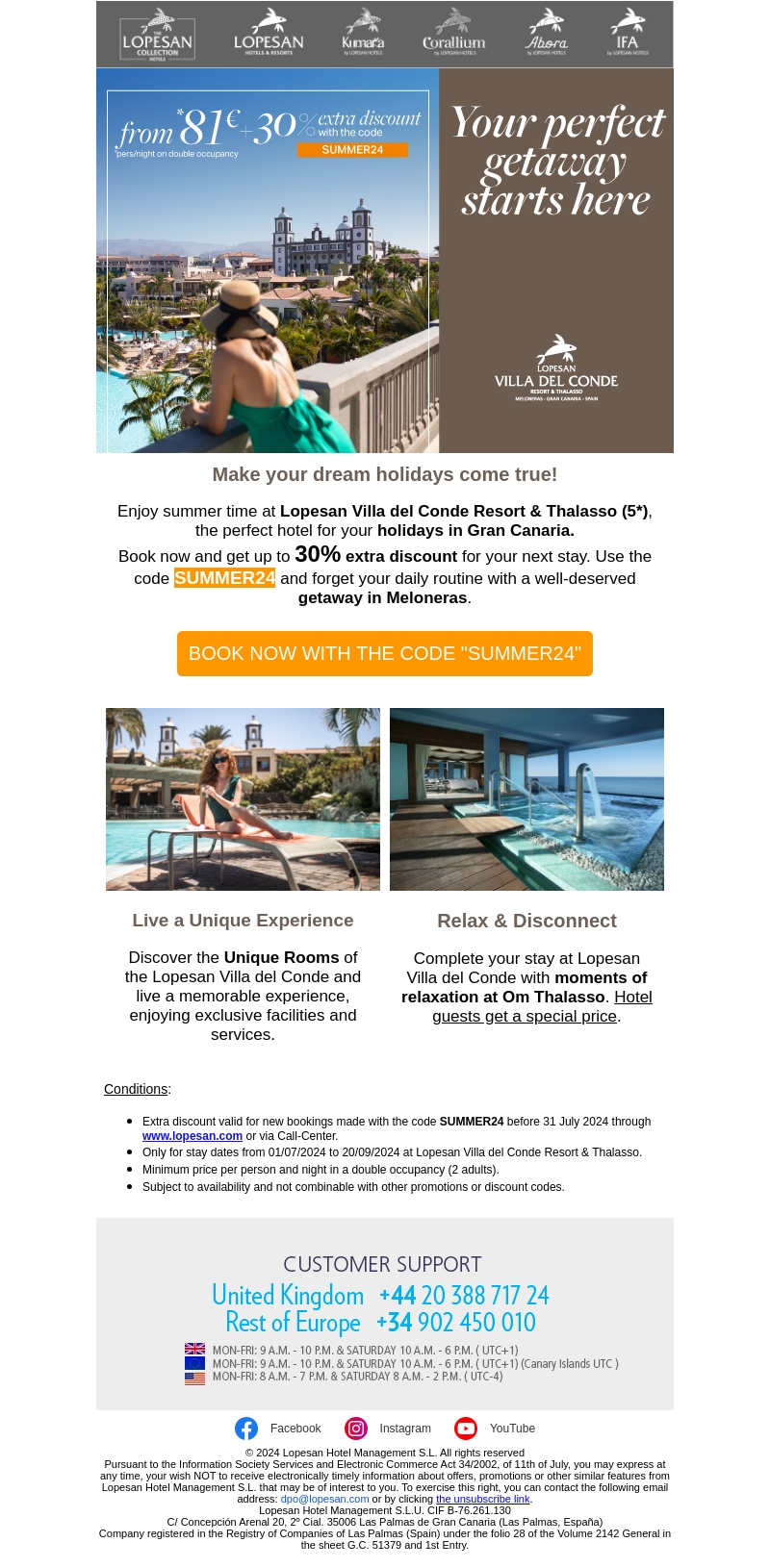 Beleef een geweldige zomer in Lopesan Villa del Conde Resort & Thalasso (5*) in Gran Canaria. Profiteer van 30% extra korting op uw verblijf met de code SUMMER24. Ontdek de unieke kamers en geniet van ontspanning bij Om Thalasso. Boek nu en ontsnap aan de dagelijkse sleur.