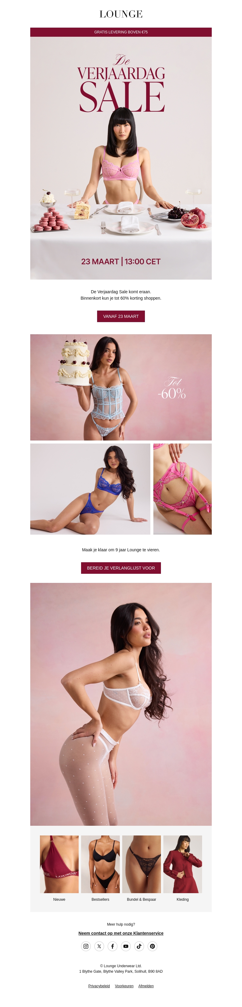 De Verjaardag Sale van Lounge komt eraan! Geniet van kortingen tot 60% op diverse stijlvolle lingerie-items. Zorg dat je je verlanglijstje gereed hebt voor deze spectaculaire aanbieding. Gratis levering bij besteding boven €75. Start op 23 maart om 13:00 uur CET.