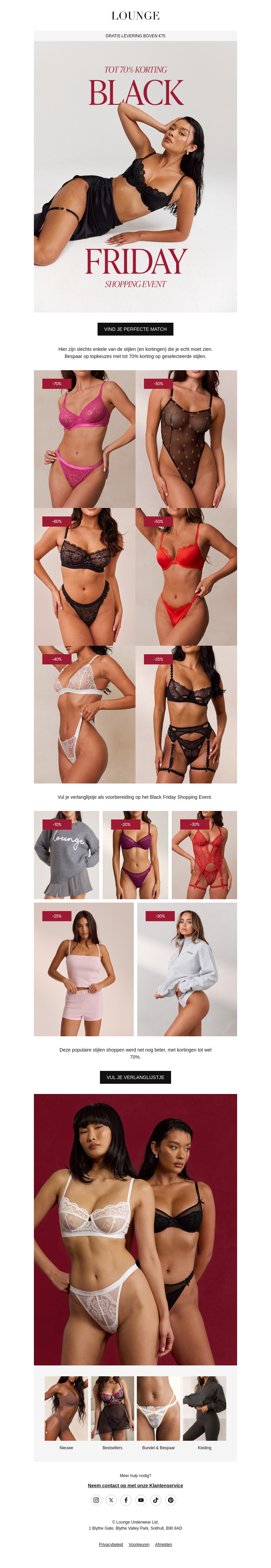 Bereid je voor op een spectaculaire Black Friday met kortingen tot wel 70%. Deze nieuwsbrief van Lounge presenteert een uitgebreide collectie lingerie en loungewear tegen onweerstaanbare prijzen. Maak je garderobe compleet met stijlvolle stukken en bespaar flink. Mis deze kans niet om je favoriete items aan te schaffen voor minder.