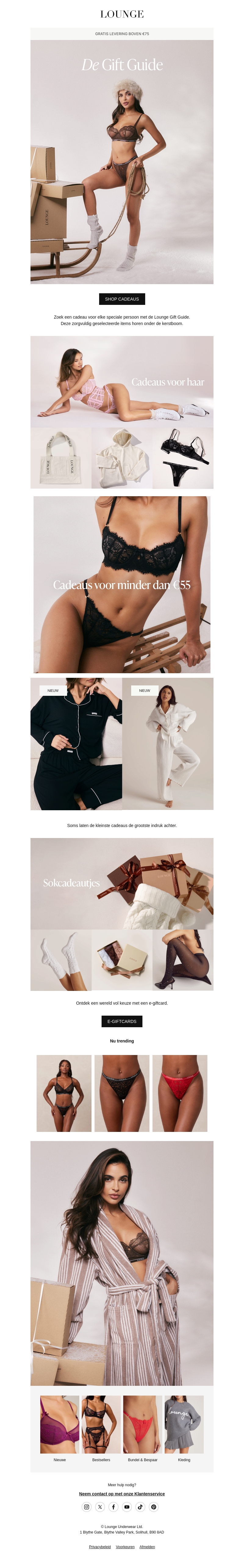 De Gift Guide biedt een selectie van stijlvolle en comfortabele kledingstukken. Van luxe lingerie tot warme pyjama's, er is voor elk wat wils. Ontdek cadeaus voor minder dan €55 en verwen jezelf of een geliefde. Perfect voor de feestdagen, deze collectie biedt elegante opties om iemand speciaal te verrassen.