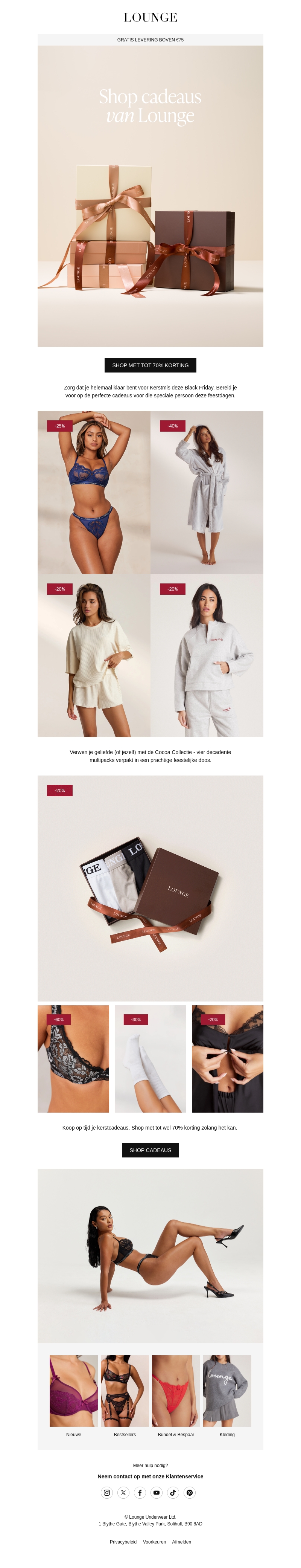 Maak je klaar voor de feestdagen met onze exclusieve cadeaus van Lounge. Profiteer van kortingen tot 70% op stijlvolle lingerie en loungewear. Perfect voor kerstcadeaus of als verwennerij voor jezelf. Bekijk onze collectie en sla je slag voordat de deals verdwijnen. Mis deze kans niet om luxe tegen een geweldige prijs te bemachtigen. Shop nu en ontdek jouw must-haves!