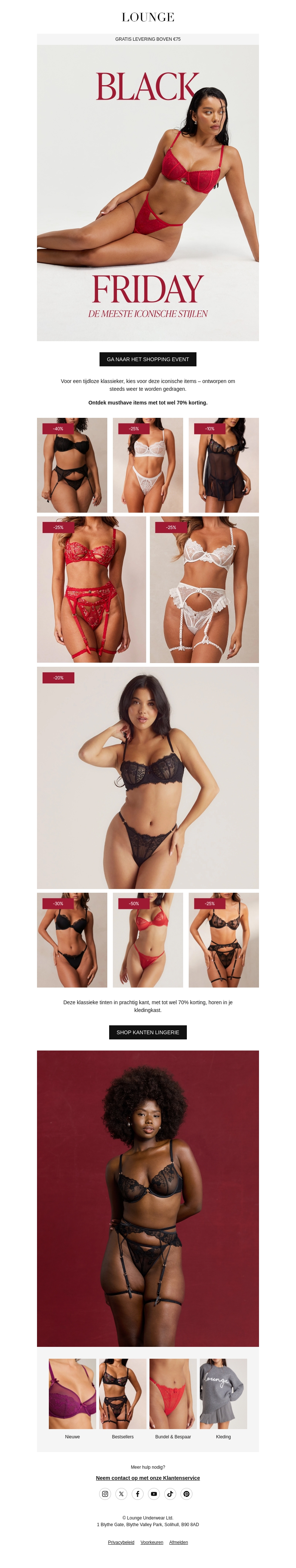 De Black Friday sale van Lounge biedt verleidelijke lingerie met kortingen tot wel 70%. Mis deze kans niet om je collectie aan te vullen met stijlvolle items. Diverse sets en kleuren zijn beschikbaar om je garderobe compleet te maken. Shop nu en geniet van exclusieve aanbiedingen op de meest gewilde items.