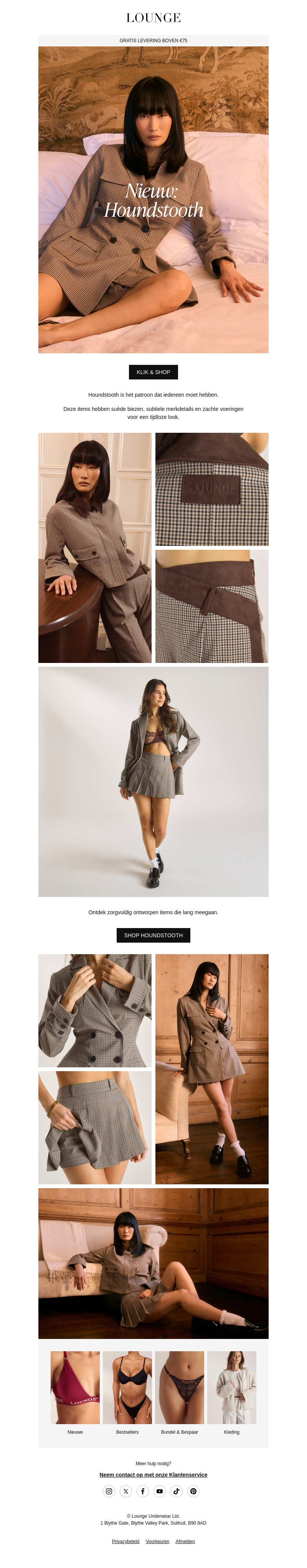 De houndstooth is terug in de mode! Deze nieuwsbrief introduceert de nieuwste collectie met dit klassieke patroon. Geniet van chique en veelzijdige items die zorgvuldig zijn ontworpen om lang mee te gaan. De collectie biedt alles van blazers tot jurken, ideaal voor zowel casual als formele gelegenheden. Maak je look compleet met zachte materialen en subtiele details. Profiteer van gratis levering bij bestellingen boven €75.
