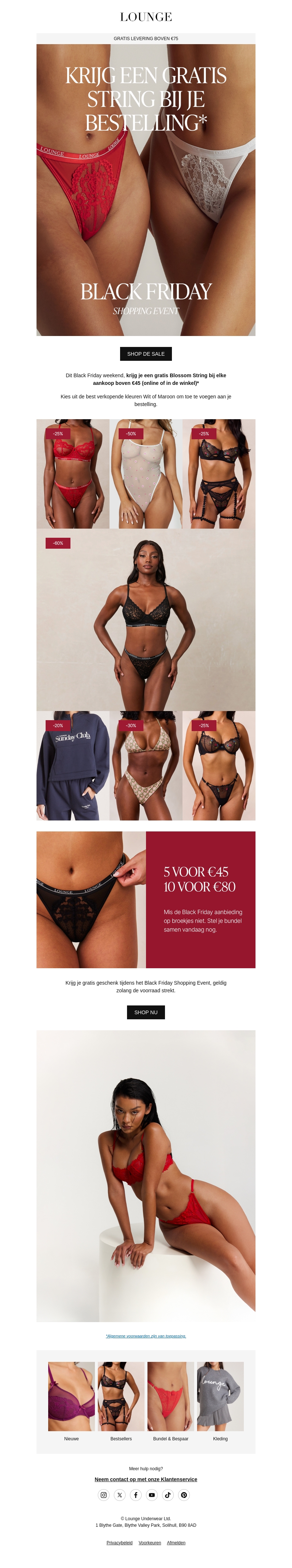 Geniet van de speciale Black Friday actie waarbij je een gratis string krijgt bij elke bestelling. Bekijk de nieuwste collectie lingerie en voeg je favorieten toe aan je winkelmandje. Deze week kun je ook profiteren van bundelkortingen. Krijg een cadeau bij je aankoop en upgrade je lingerielade met stijlvolle stukken. Bestel vandaag nog om te profiteren van deze exclusieve aanbieding. Wees er snel bij, want de voorraad is beperkt.