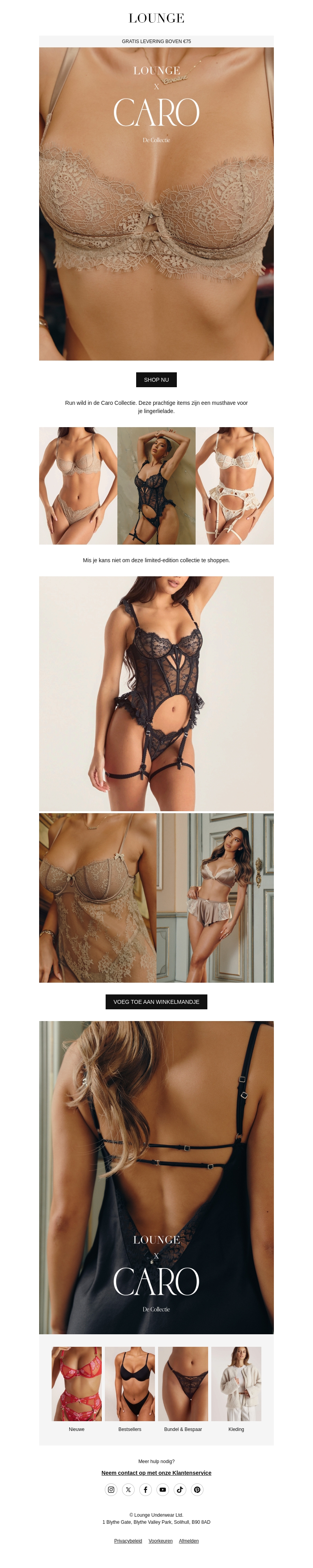 Duik in de prachtige Caro Collectie van Lounge. Deze exclusieve serie biedt verfijnde lingerie, ontworpen om je zelfverzekerd en stijlvol te laten voelen. Van delicaat kant tot flatterende silhouetten, deze collectie heeft het allemaal. Mis de kans niet om deze limited edition items aan je lingeriecollectie toe te voegen.