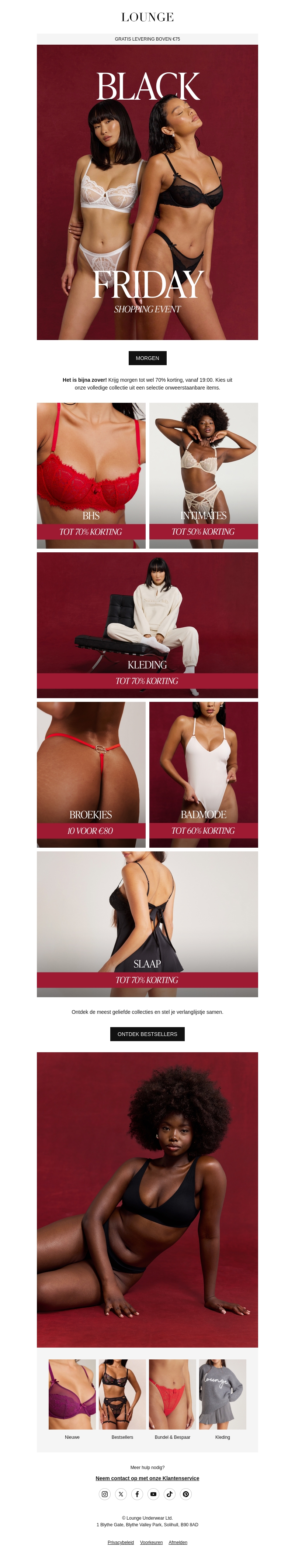 Doe mee aan Lounge's Black Friday Shopping Event voor de beste kortingen van het jaar. Geniet van tot wel 70% korting op bh's, kleding, en meer. Ontdek onze nieuwste collectie en koop je favorieten voordat ze uitverkocht raken. Mis deze kans niet om je garderobe aan te vullen met luxe items. Shop vanaf morgen en ervaar de ultieme koopervaring. Zorg dat je niets mist van deze waanzinnige aanbiedingen!