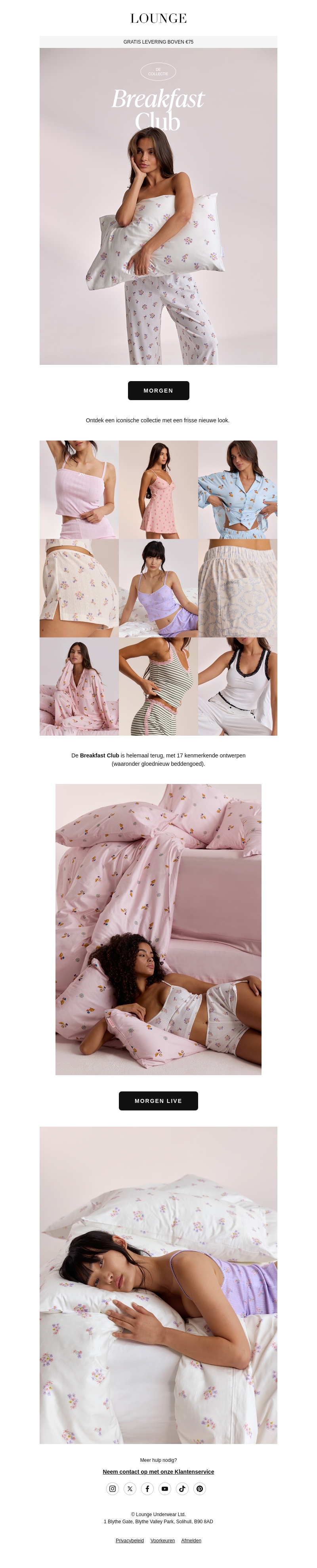 Laat je inspireren door de nieuwste collectie van Lounge Sleep: Breakfast Club. Deze collectie biedt comfortabele en stijlvolle nachtkleding en accessoires. Bovendien geniet je van gratis levering boven €75. Ontdek morgen de nieuwe ontwerpen.