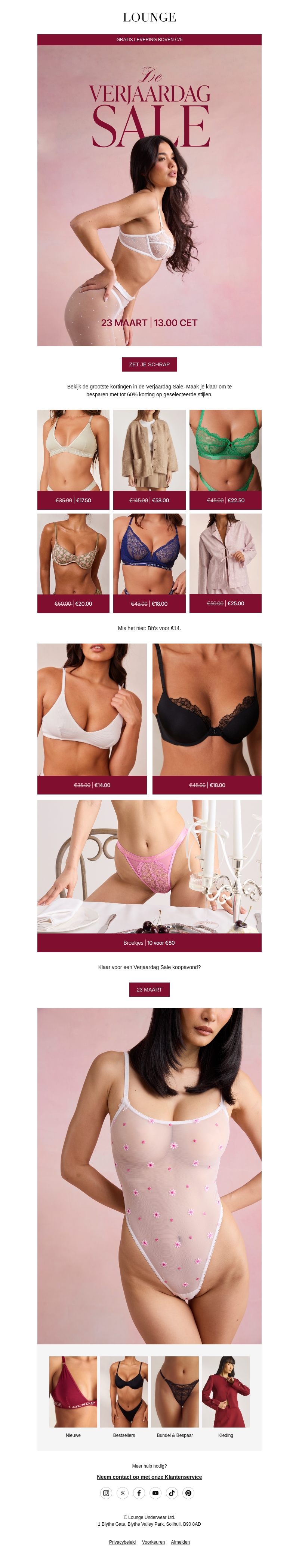 De Verjaardag Sale van Lounge is begonnen! Ontvang tot wel 60% korting op een breed scala aan stijlvolle lingerie. Bereid je voor op de verleidelijke deals die vanaf 23 maart beschikbaar zijn. Van prachtige sets tot flatterende losse items, alles is sterk afgeprijsd. Wacht niet te lang, de voorraad is beperkt. Ontdek jouw nieuwe favoriete set nu.