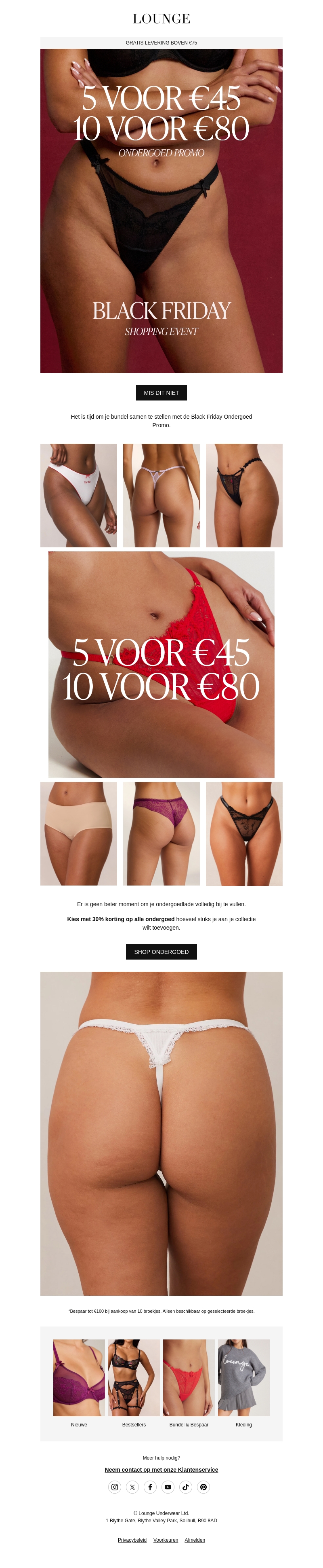 Ontvang enorme kortingen tijdens onze Black Friday ondergoedpromotie. Kies 5 of 10 artikelen voor een speciale prijs. Profiteer van gratis verzending bij bestellingen boven €75. Creëer je perfecte bundel en vernieuw je garderobe met stijl. Mis deze unieke gelegenheid niet om te besparen.