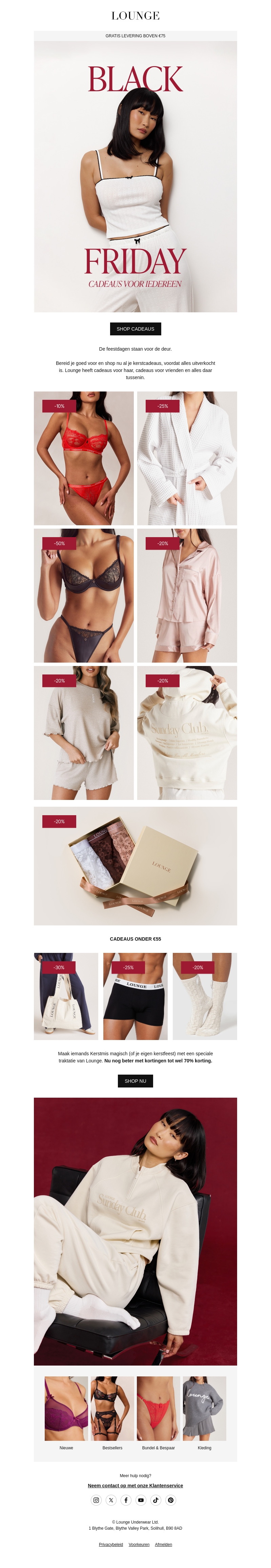 Bij Lounge vind je nu de perfecte cadeaus met kortingen tot 70%. Voor de feestdagen biedt Lounge een breed assortiment aan lingerie en loungewear. Mis de kans niet om voordelig stijlvolle geschenken te scoren voor vrienden en familie. De kortingen zijn slechts tijdelijk beschikbaar. Bekijk nu de mooiste aanbiedingen en verras je dierbaren met een onvergetelijk cadeau.