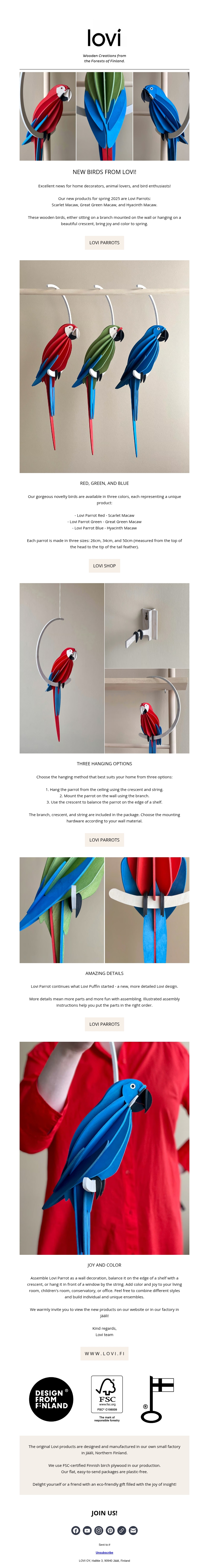 De nieuwe Lovi papegaaien zijn de perfecte aanvulling op je interieur deze lente. Verkrijgbaar in rood, groen en blauw, brengen deze vogels kleur en elegantie in elke ruimte. Met duurzame materialen en eenvoudige montagestijl zijn ze zowel milieuvriendelijk als stijlvol. Laat je inspireren door de unieke ontwerpen en bereid je voor op een vrolijke lente. Ontdek de charme van Lovi vandaag nog!