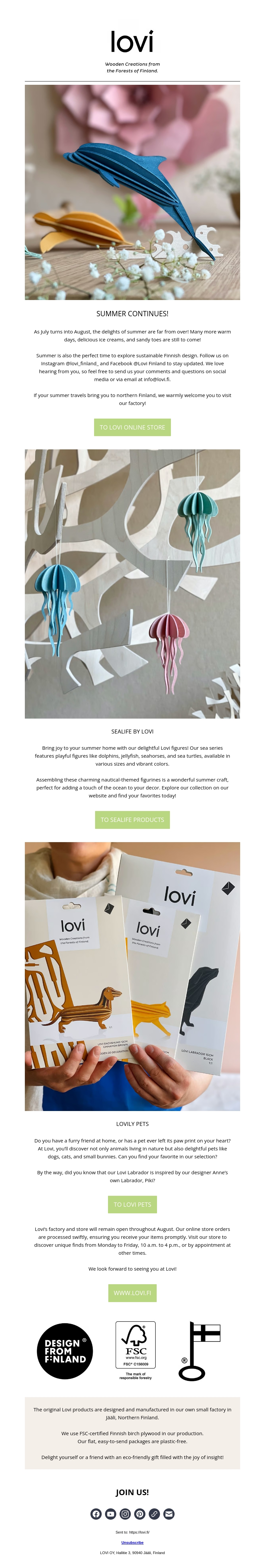 Geniet van de zomer met de duurzame houten creaties van Lovi uit Finland. Van speelse zeedieren tot schattige huisdierfiguren, breng een vleugje natuur in huis. Bekijk onze online store voor exclusieve ontwerpen en blijf op de hoogte via onze social media kanalen.