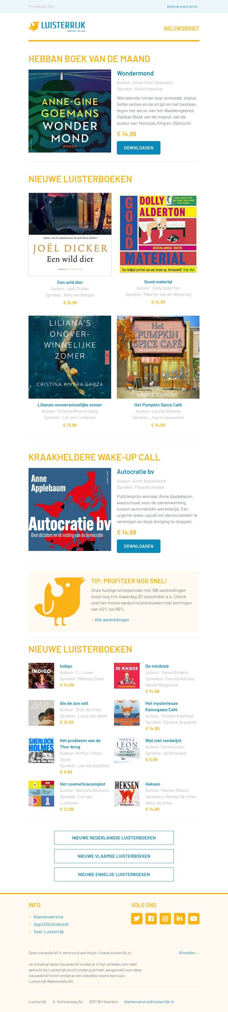 Verken de meeslepende roman 'Wondermond' en andere nieuwe luisterboeken zoals 'Een wild dier' en 'Het Pumpkin Spice Café'. Krijg een kraakheldere wake-up call met 'Autocratie bv'. Profiteer van onze septemberkortingen en bekijk alle aanbiedingen snel!