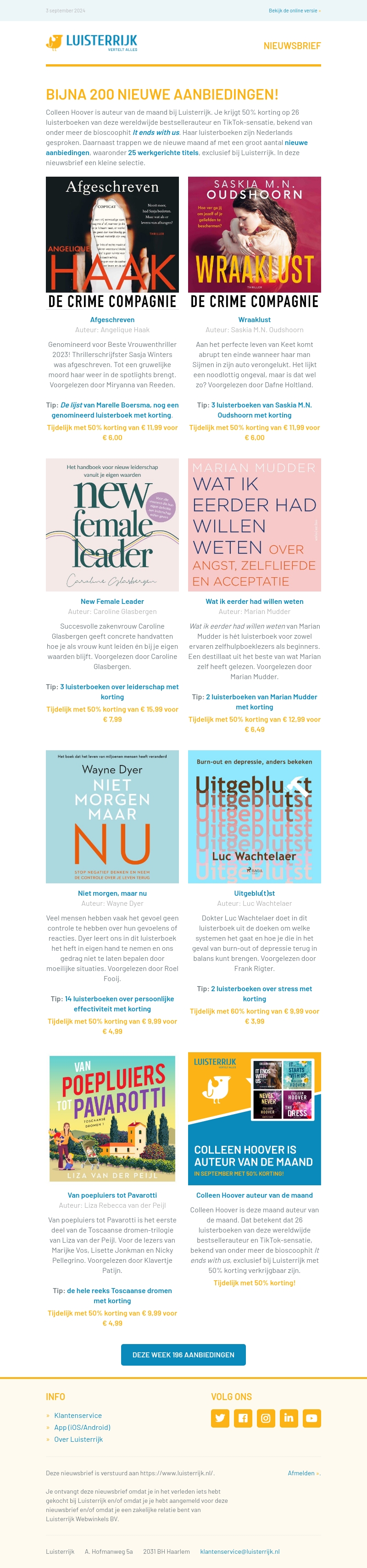 Ontdek bijna 200 nieuwe aanbiedingen bij Luisterrijk! Profiteer van tot 67% korting op luisterboeken en 50% korting op alle titels van Colleen Hoover. Mis deze kans niet om je favoriete boeken te scoren tegen gereduceerde prijzen.
