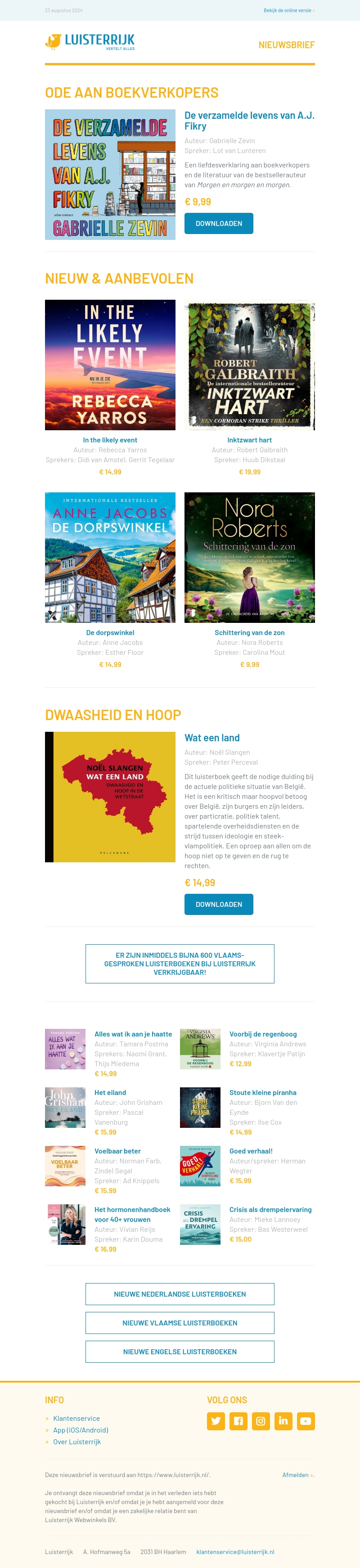 Deze nieuwsbrief biedt een ode aan boekverkopers en presenteert nieuwe en aanbevolen luisterboeken van populaire auteurs zoals Rebecca Yarros, Robert Galbraith, Anne Jacobs en Nora Roberts. Noël Slangen deelt inzicht over België. Profiteer van de laatste trends en aanbevelingen in de literatuurwereld.
