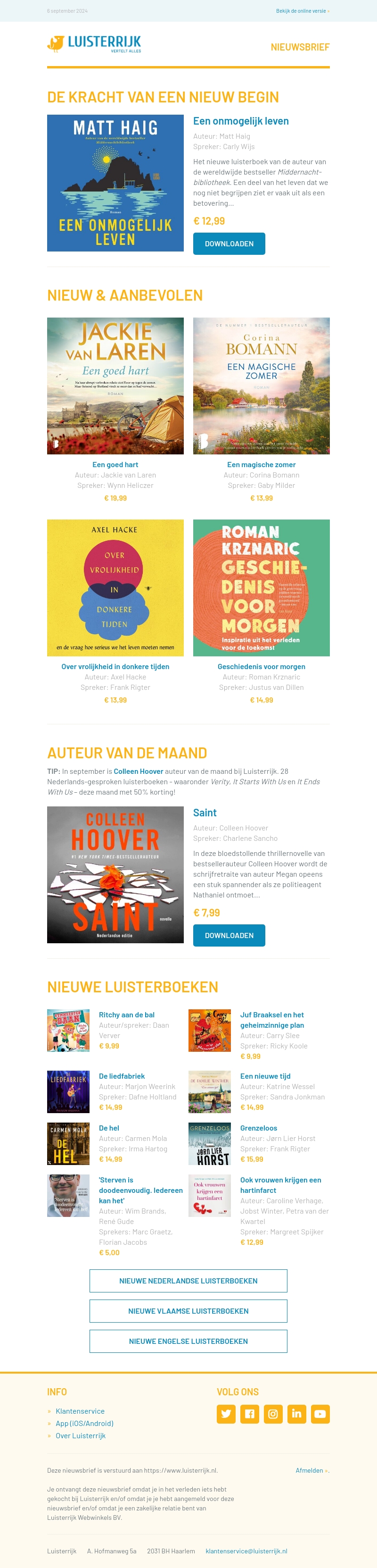 Deze maand special aanbiedingen bij Luisterrijk! Ontdek het nieuwste luisterboek van Matt Haig 'Een onmogelijk leven'. Profiteer van 50% korting op Colleen Hoover's 'Saint'. Bekijk ook nieuwe releases van Jackie van Laren, Corina Bomann, en Jørn Lier Horst, en mis niet de aanbevolen audioboeken!