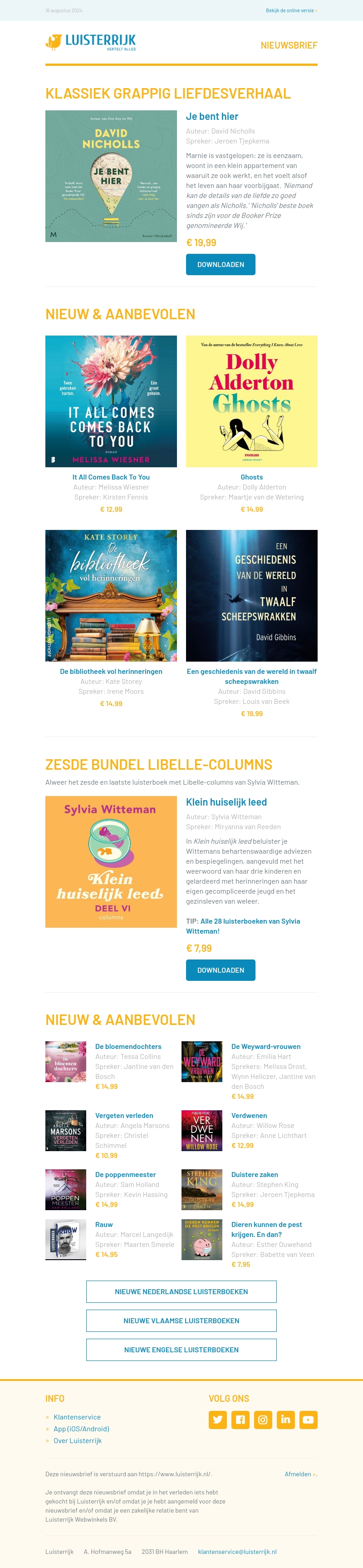Deze nieuwsbrief introduceert nieuwe werken van Sylvia Witteman en David Nicholls, evenals boeiende geschiedenisverhalen en meer. Verken het klassieke grappige liefdesverhaal 'Je bent hier' van David Nicholls of duik in de nieuwste columns van Sylvia Witteman. Ontdek unieke boeken die je niet wilt missen.