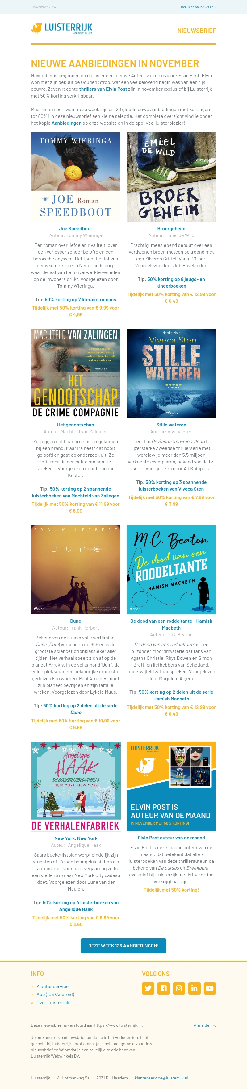 Begin november met maar liefst 126 aanbiedingen! Profiteer van 50% korting op bestsellers zoals Joe Speedboot van Tommy Wieringa. Elvin Post is de auteur van de maand, met exclusieve kortingen op zijn thrillers. Mis ook de aanbiedingen op kinder- en jeugdboeken, spannende luisterboeken, en meer. Deze maand biedt voor ieder wat wils met kortingen tot wel 80%.