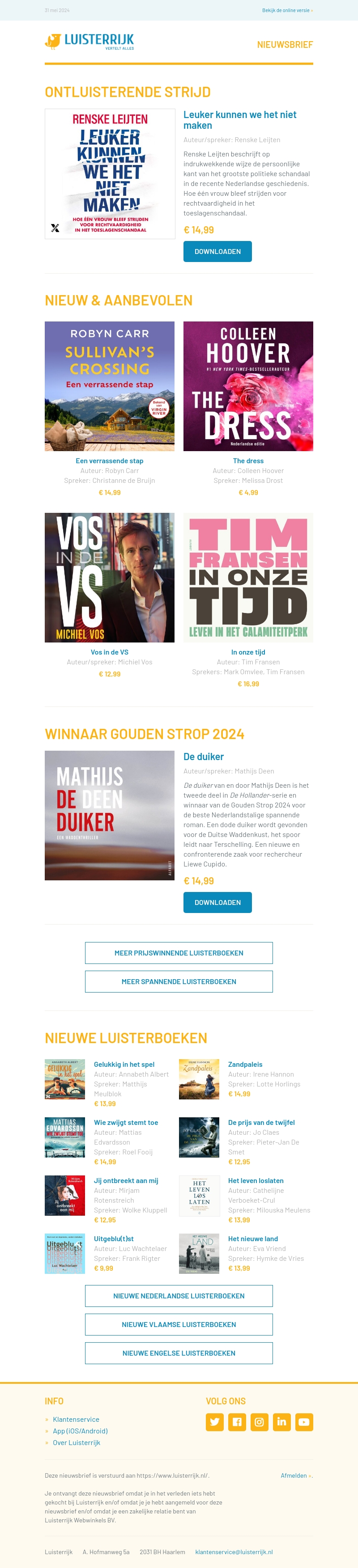 In deze nieuwsbrief leest u over Renske Leijten's strijd tegen het toeslagenschandaal, de nieuwste boeken van Colleen Hoover en Robyn Carr, en de bekroonde thriller van Mathijs Deen. Mis ook de exclusieve aanbiedingen niet!