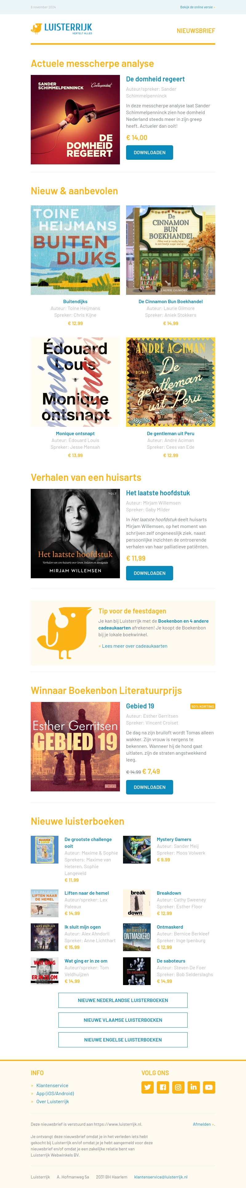 Ontdek de nieuwste boeken en analyses van populaire auteurs. Sander Schimmelpenninck biedt een scherpe blik op domheid in Nederland. Beleef magische verhalen van Toine Heijmans en duik in nieuwe romans van Édouard Louis en André Aciman. Mis niet de winnaar van de Boekenbon Literatuurprijs en ontdek de nieuwste luisterboeken.