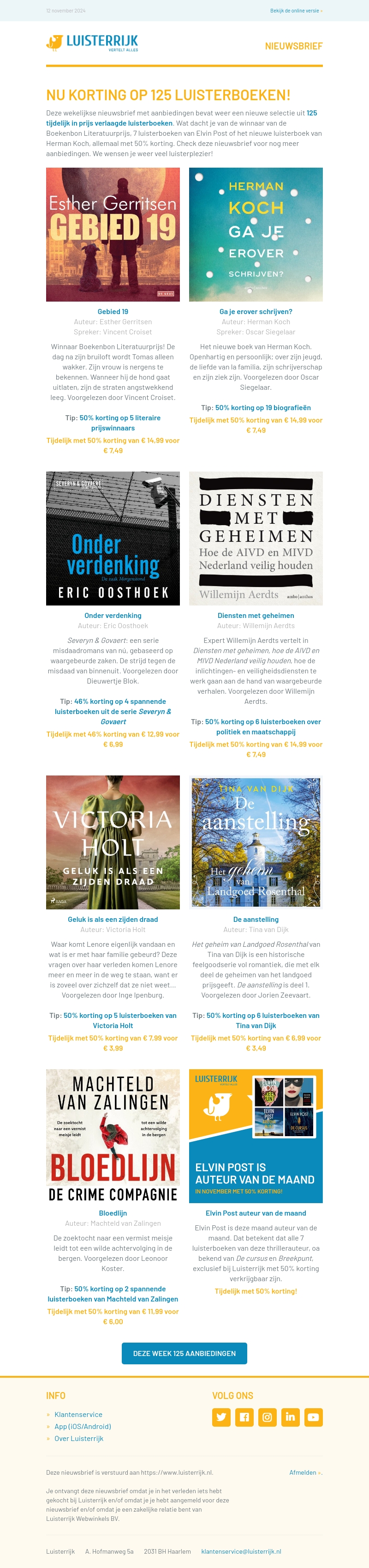 Geniet van tijdelijk tot 80% korting op een selectie van 125 luisterboeken bij Luisterrijk. Ontdek werken van bekende auteurs zoals Esther Gerritsen, Herman Koch en Victoria Holt. Deze week bieden wij geweldige titels tegen scherpe prijzen. Mis deze kans niet om te luisteren naar literair succes. Bezoek onze site voor meer actuele aanbiedingen.