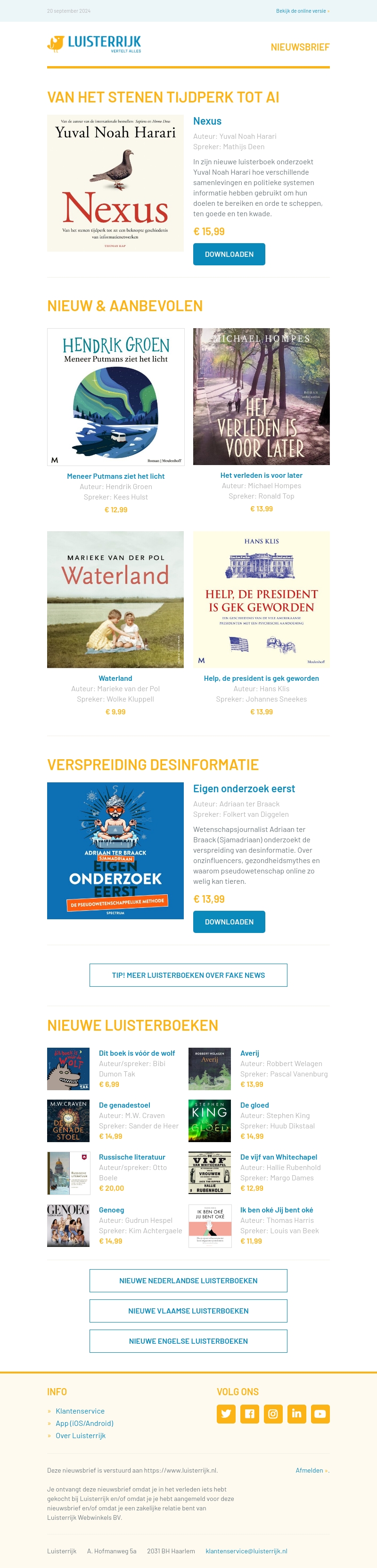 Blijf up-to-date met de nieuwste luisterboeken van top auteurs zoals Yuval Noah Harari, Hendrik Groen, Marieke van der Pol en anderen. Leer meer over verschillende samenlevingen, politieke systemen, en ontkom aan desinformatie. Bekijk onze aanbevelingen en ontdek nieuwe titels vandaag nog.