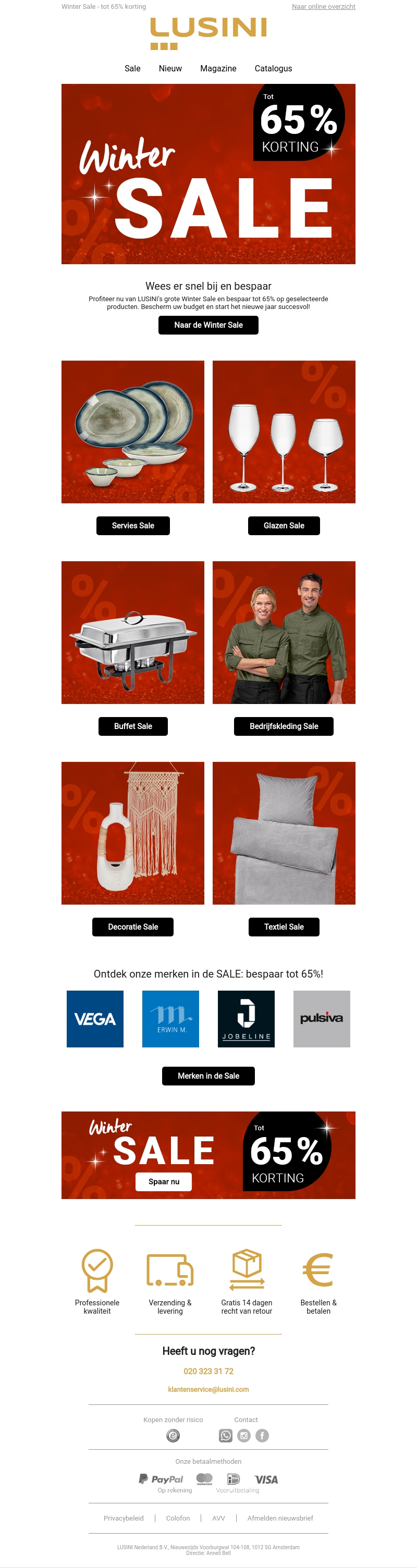 Profiteer van LUSINI's grote Winter Sale met kortingen tot wel 65% op geselecteerde producten. Van servies tot textiel en alles daartussenin, er is voor ieder wat wils. Zorg dat u snel bent, want op=op. Begin het nieuwe jaar met geweldige deals en bespaar op kwaliteitsproducten. Verdere details zijn beschikbaar op onze website.