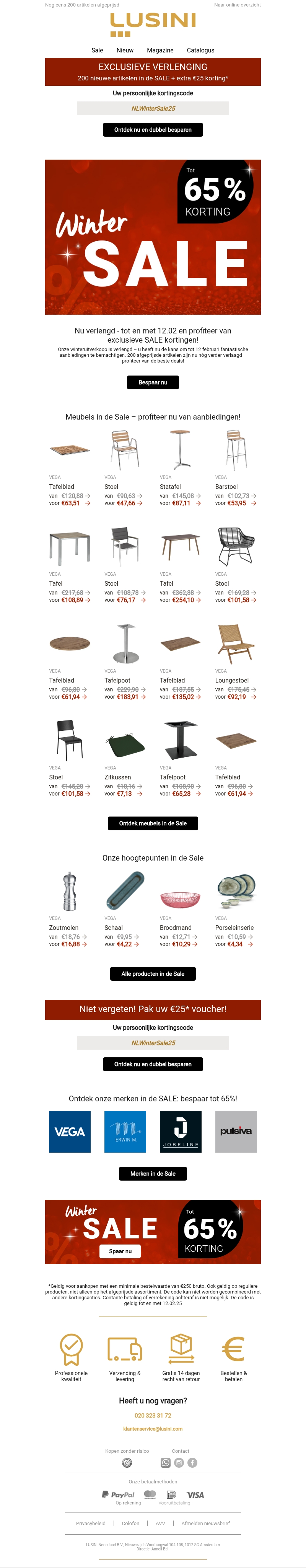 Ontdek de verlengde Winter Sale en bespaar tot 65% op een breed scala aan producten bij LUSINI. Van meubels tot servies, er zijn tal van deals om van te profiteren. Gebruik de speciale kortingscode en ontvang extra korting. Aanbiedingen zijn geldig tot 12 februari. Mis deze kans niet om kwaliteitsproducten voor een geweldige prijs te kopen!