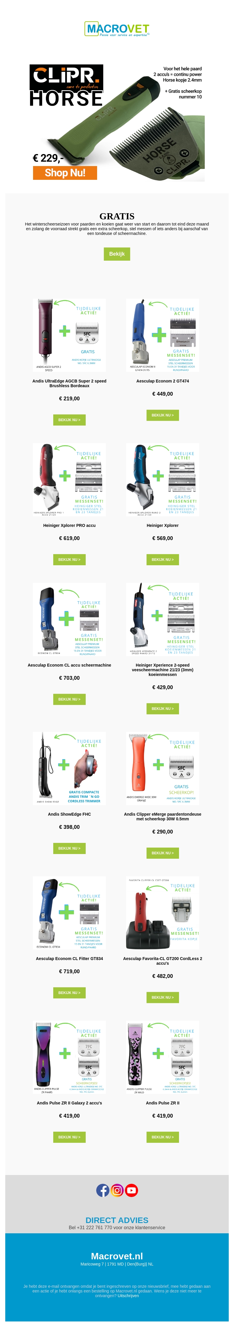 Heb je nieuwe tondeuses of scheerapparaten nodig? Mis deze geweldige aanbieding niet van Macrovet! Bij aankoop van geselecteerde modellen krijg je gratis scheermessen of een scheerkopje. Bekijk ons assortiment en kies het apparaat dat het beste bij jouw behoeften past. Zorg ervoor dat je op tijd bestelt om van deze tijdelijke actie te profiteren. Ontdek nu de besparingen!