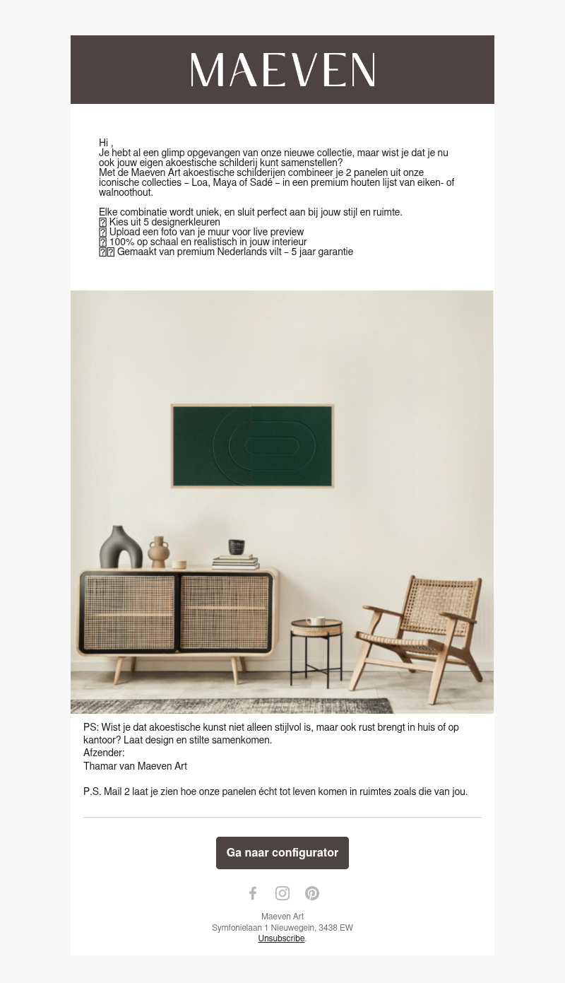 Met de nieuwe Maeven Art collectie kun je nu je eigen akoestisch schilderij samenstellen. Kies uit verschillende kleuren en upload je eigen foto voor een live preview. Elk ontwerp is uniek en past perfect bij jouw stijl en ruimte. De schilderijen zijn gemaakt van premium Nederlands vilt en bieden een garantie van 5 jaar.