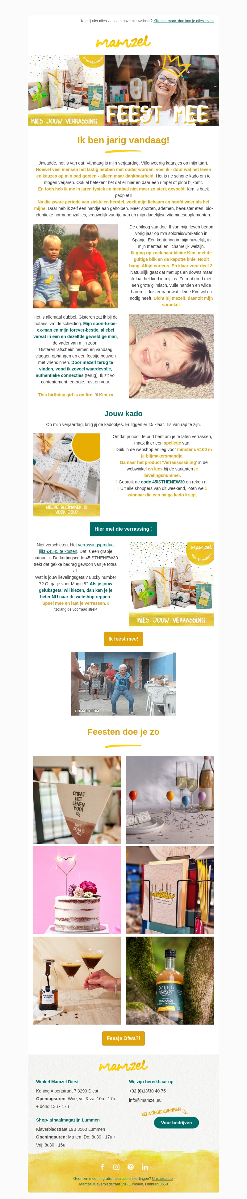 Vier mee met Kim's verjaardag en ontvang een speciaal cadeau! Kies jouw verrassing en geniet van een unieke ervaring met Mamzel. Wees snel, want de cadeaus zijn klaar om naar je opgestuurd te worden. Maak kans op een van de 45 exclusieve verrassingen of kies zelf een leuke optie. Gebruik onze speciale kortingscode voor extra voordeel. Mis deze feestelijke kans niet!