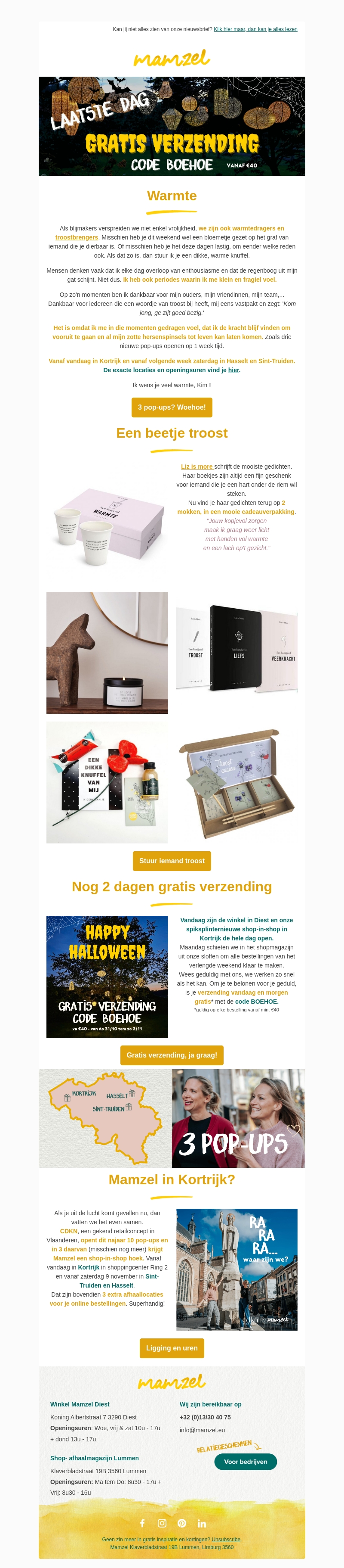 Ontvang de laatste kans op gratis verzending in Mamzel's webshop met de code BOEHOE. Deze aanbieding is geldig vanaf een besteding van €40. Daarnaast heeft Mamzel prachtige troostgeschenken zoals gedichten en mokken. Bezoek onze nieuwe pop-up winkels in Kortrijk, Hasselt en Sint-Truiden. Profiteer van de gratis verzenddagen en ontdek unieke cadeaus. Shop nu online of bezoek een van onze fysieke locaties.