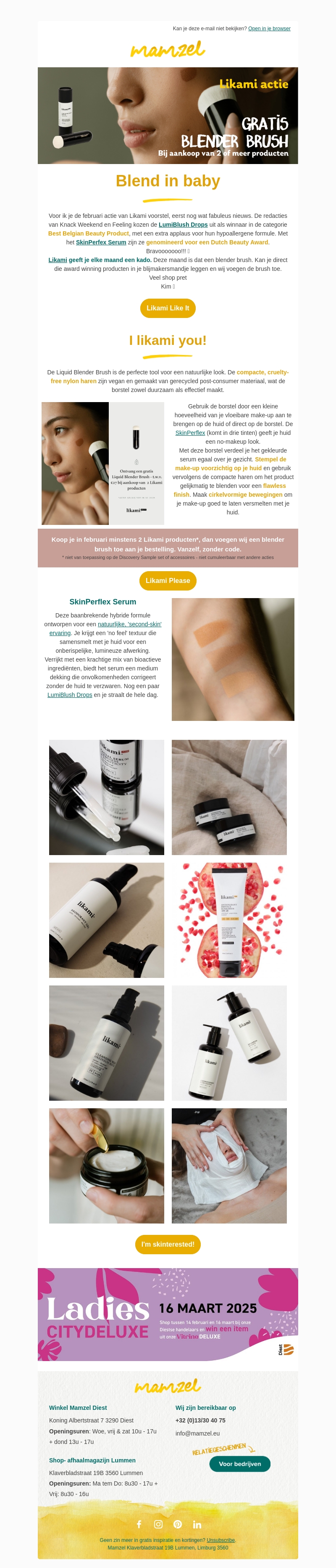 In februari biedt Likami een speciale actie aan. Bij aankoop van minimaal twee producten, ontvangt u een gratis Blender Brush. Dit is de perfecte tool voor een vlekkeloze make-up applicatie. Verfraai uw beauty routine met de hoogwaardige producten van Likami. Mis deze geweldige kans niet!
