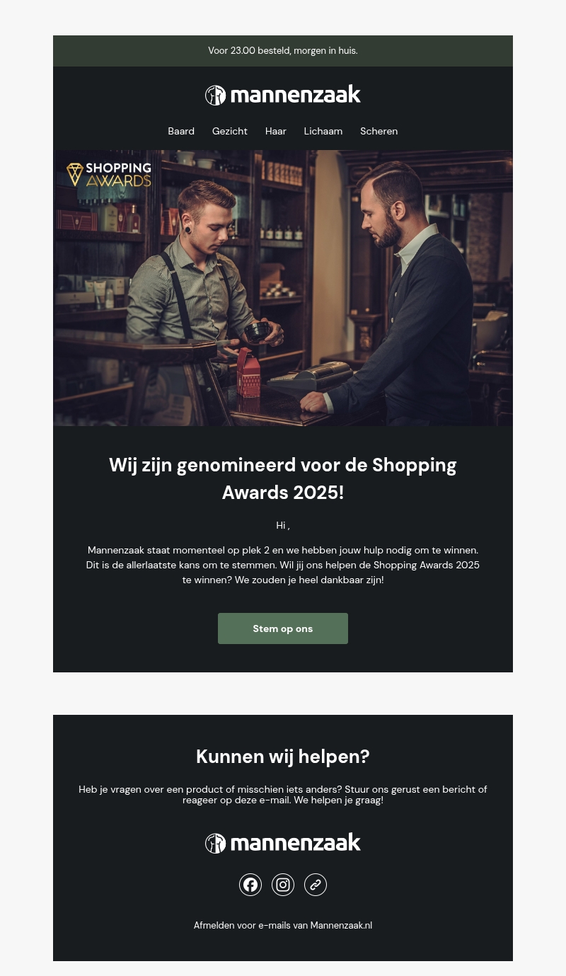 Mannenzaak is genomineerd voor de prestigieuze Shopping Awards 2025. Momenteel staan we op de tweede plaats en hebben we jouw hulp nodig om te winnen. Dit is je laatste kans om te stemmen en ons te helpen naar de overwinning. Jouw stem kan het verschil maken! Stem nu en steun ons!