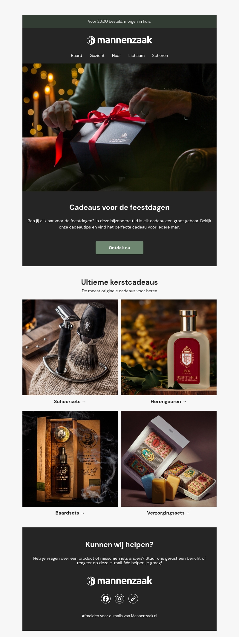 Ben je op zoek naar het ideale kerstcadeau voor de man in je leven? Ontdek onze selectie van scheersets, herengeuren en verzorgingsproducten. Elke man verdient iets bijzonders tijdens de feestdagen. Laat je inspireren door onze cadeau-ideeën en maak van deze kerst een onvergetelijke tijd.