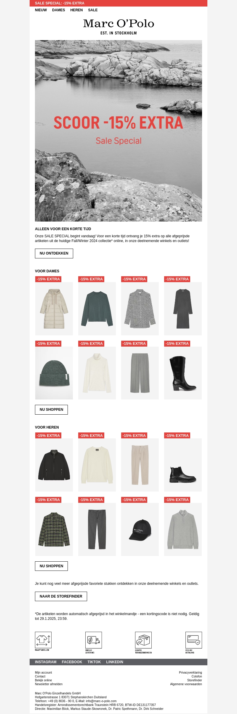 Profiteer van exclusieve kortingen tijdens de Marc O'Polo Sale Special! Ontvang een extra 15% korting op geselecteerde artikelen uit de Fall/Winter 2024 collectie. Deze aanbieding is beschikbaar in geselecteerde winkels en outlets. Grijp je kans om je garderobe te vernieuwen met stijlvolle kleding voor dames en heren. Alleen voor een beperkte periode, dus mis het niet!