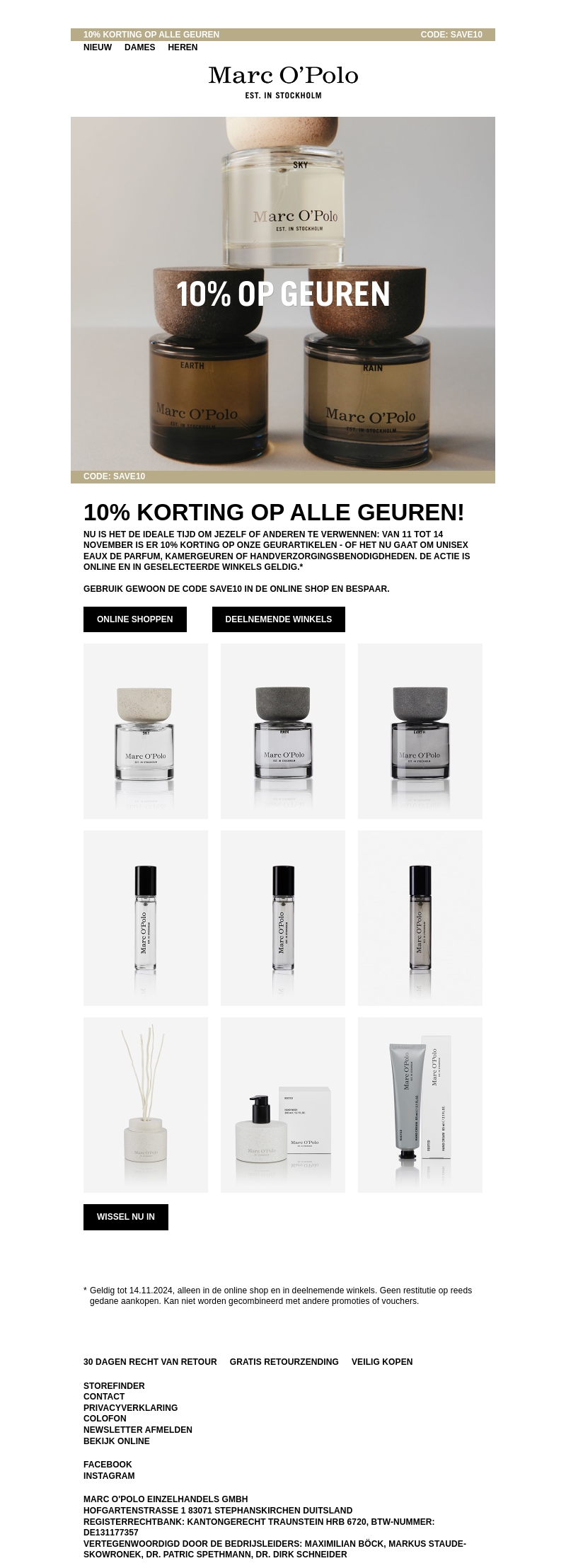 Neem de tijd om uzelf of anderen te verwennen met 10% korting op het volledige aanbod aan geuren van Marc O'Polo. Deze aanbieding geldt voor zowel unisex parfums als kamer- en handverzorgingsproducten. Gebruik de code SAVE10 om te besparen bij online aankopen of in geselecteerde winkels. Zorg ervoor dat u voor 14 november profiteert van deze speciale aanbieding.