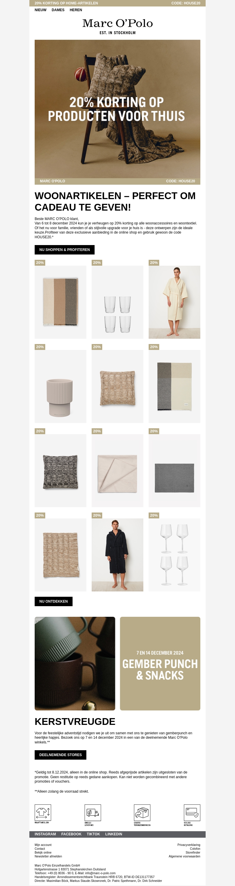 Profiteer van 20% korting op alle woonaccessoires en woningtextiel bij Marc O'Polo. Deze aanbieding is perfect voor een stijlvolle upgrade van je huis. Gebruik de code HOUSE20 in de online shop. Geldig van 1 tot 8 december 2024. Ontdek het gemak en de luxe van hoogwaardige producten.