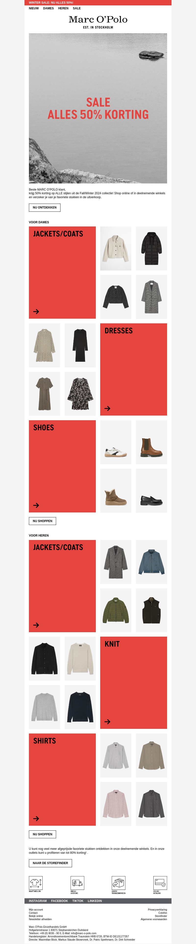 Mis deze kans niet op de Marc O'Polo wintercollectie! Alles 50% korting, inclusief jassen, jurken, schoenen en meer. Shop online of in geselecteerde winkels. Bekijk de nieuwste trendstukken die je niet wilt missen. Comfortabele en stijlvolle items voor zowel dames als heren.