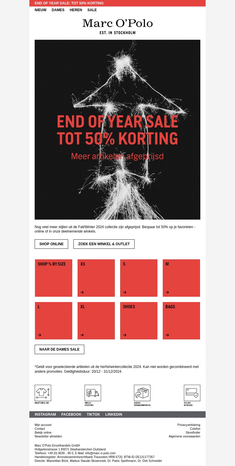 De eindejaarsuitverkoop van Marc O'Polo biedt tot wel 50% korting op geselecteerde artikelen uit de Fall/Winter 2024 collectie. Profiteer van deze geweldige aanbiedingen en vernieuw je garderobe met stijlvolle items. Bezoek onze winkels of shop online voor de beste deals.