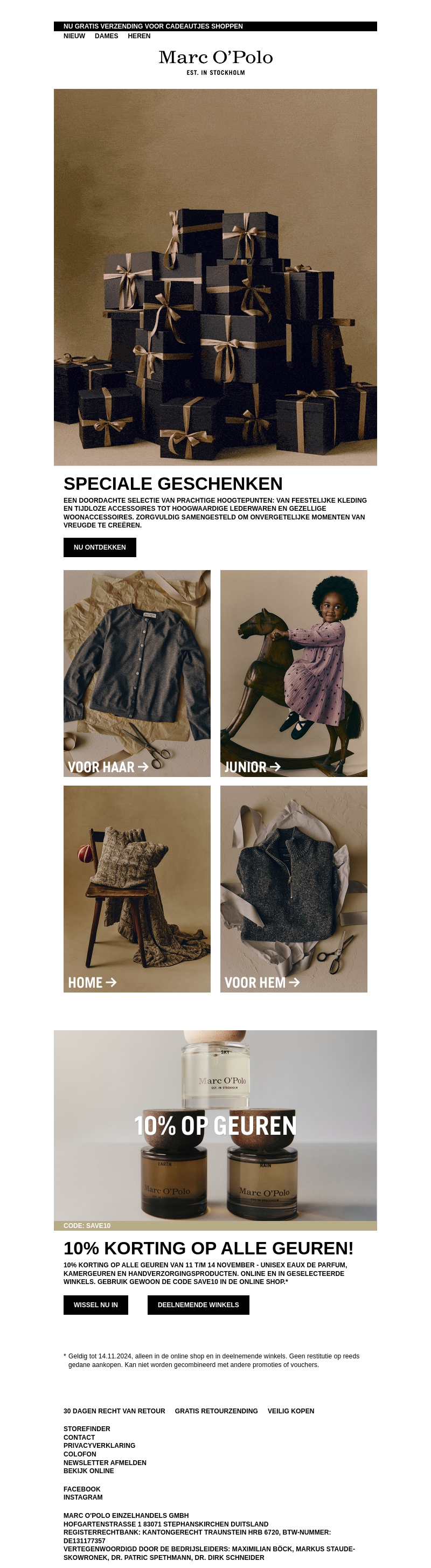 Verwen uzelf of uw dierbaren met een prachtige selectie van kleding, accessoires en woonartikelen van Marc O'Polo. Ontdek speciale geschenken die zorgen voor vreugdevolle momenten. Plus, ontvang nu 10% korting op alle geuren online en in geselecteerde winkels. Gebruik de code SAVE10 bij uw aankoop.