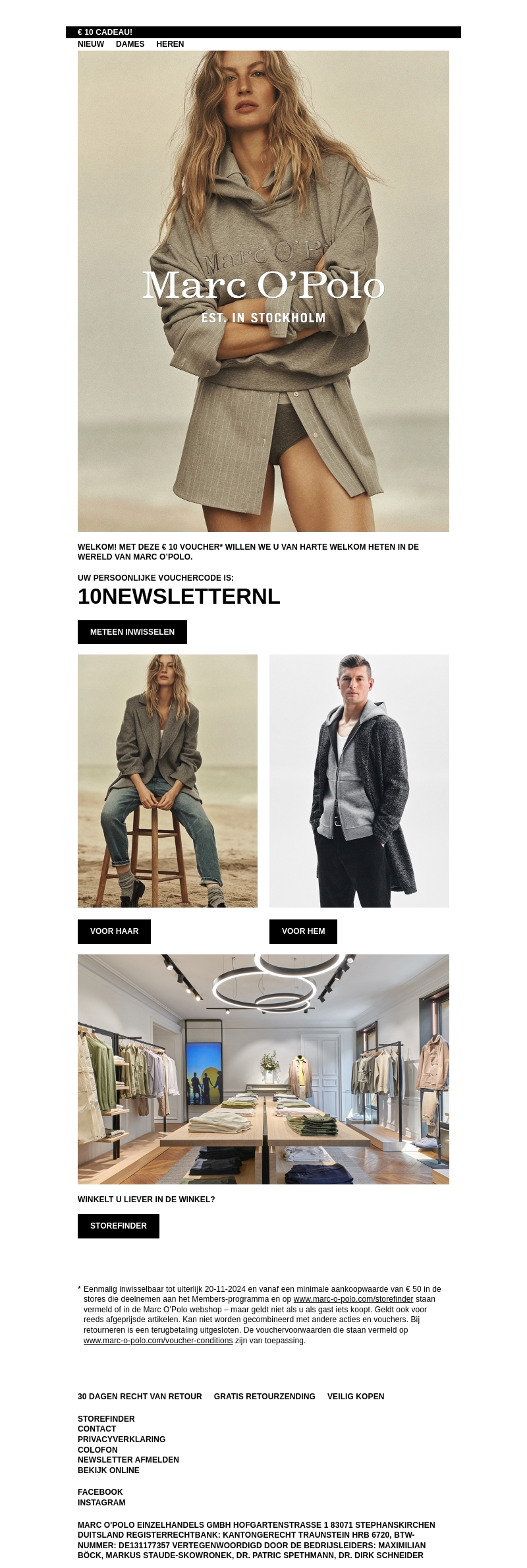 Welkom bij Marc O'Polo! Ontvang een €10 voucher als welkomsgeschenk. Bekijk onze nieuwste collectie voor dames en heren. Winkel online of in de winkel. Uw persoonlijke code is 10NEWSLETTERNL.