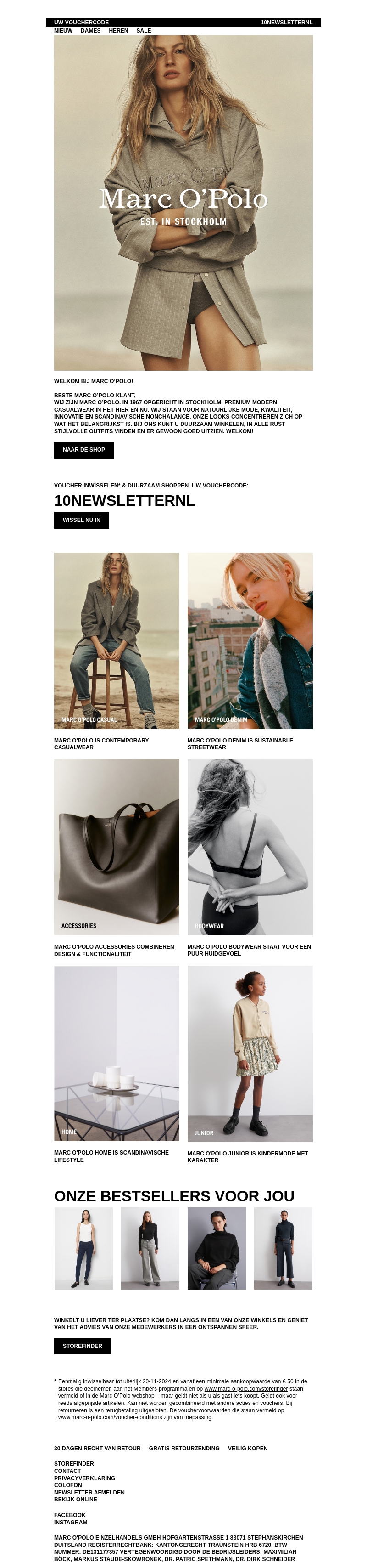Welkom bij Marc O’Polo! Verken onze collectie zoals casualwear, denim, accessoires en meer. Met een sterke focus op kwaliteit en duurzaamheid, biedt Marc O’Polo moderne casualmode geïnspireerd door Scandinavische tradities. Maak kennis met onze bestsellers en gebruik onze exclusieve kortingscode.
