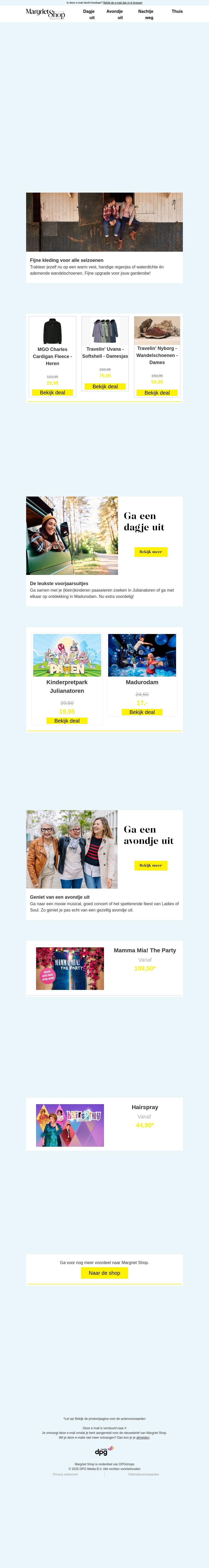 Profiteer van geweldige kortingen op fleece vesten, jassen en schoenen. Daarnaast bieden wij ook exclusieve deals voor een leuk dagje of avondje uit. Ontdek de nieuwste mode en onvergetelijke uitjes nu met aantrekkelijke kortingen. Wacht niet te lang en pak deze deals voordat ze verdwijnen!