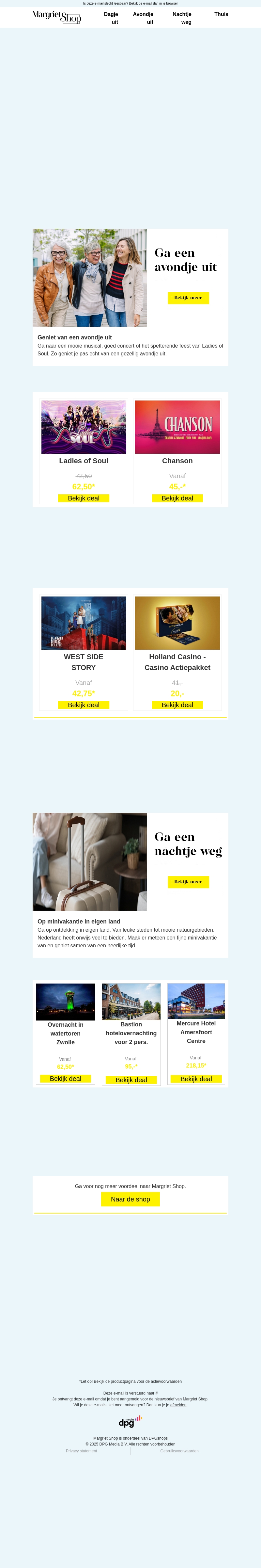 Deze nieuwsbrief van Margriet Shop biedt je de beste deals voor onvergetelijke avondjes uit en nachtjes weg. Met aanbiedingen voor concerten zoals Ladies of Soul en Chanson, en voordelige hotelarrangementen, is er voor ieder wat wils. Lees verder en ontdek de perfecte deal voor jouw volgende avontuur. Ga eropuit en geniet van een zorgeloze ervaring. Mis deze kans niet om te besparen en te genieten!