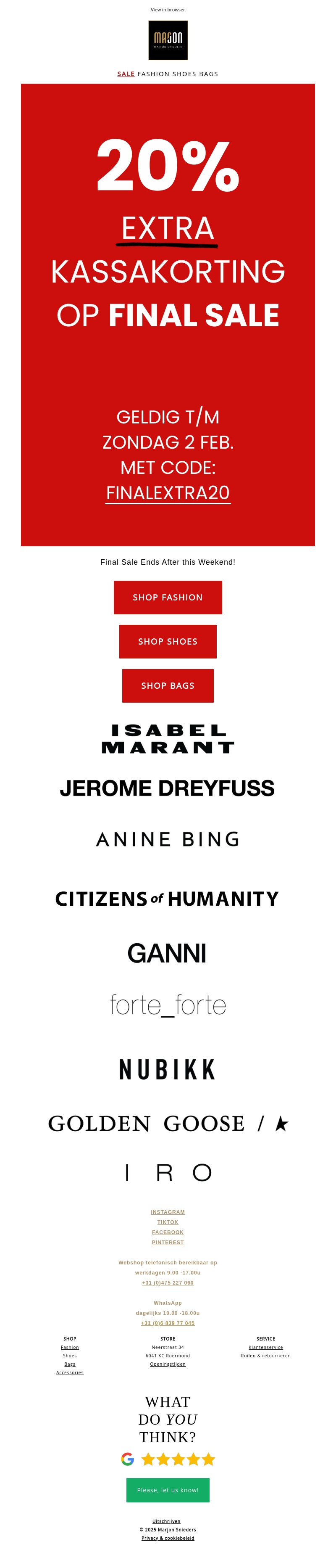 Profiteer van een fantastische korting bij Mason! Ontvang 20% extra kassakorting bovenop de huidige final sale. Dit geweldige aanbod is geldig tot en met zondag 2 februari. Mis deze kans niet om stijlvolle fashion, schoenen en tassen van topmerken met extra voordeel te kopen.