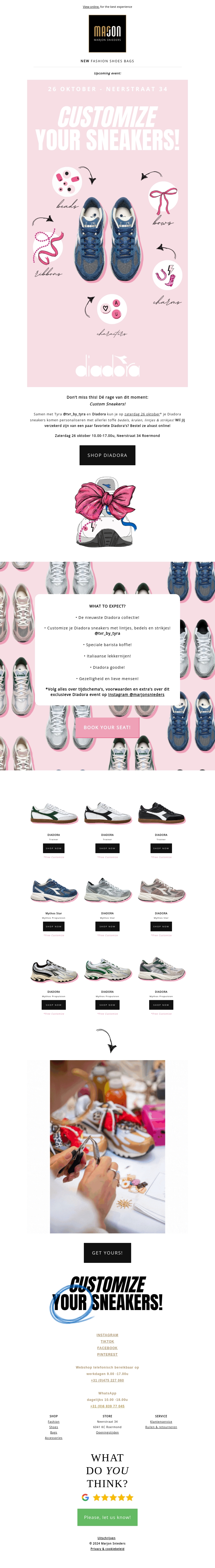 Join op 26 oktober bij het Diadora evenement waar je je sneakers kunt personaliseren. Laat je creativiteit de vrije loop met veters, bedels en ontwerpen op Neerstraat 34. Mis de kans niet om je eigen unieke stempel te drukken op je favoriete schoenen. Kom langs en geniet van een creatieve en interactieve ervaring. Geschikt voor iedereen die van mode en stijl houdt.