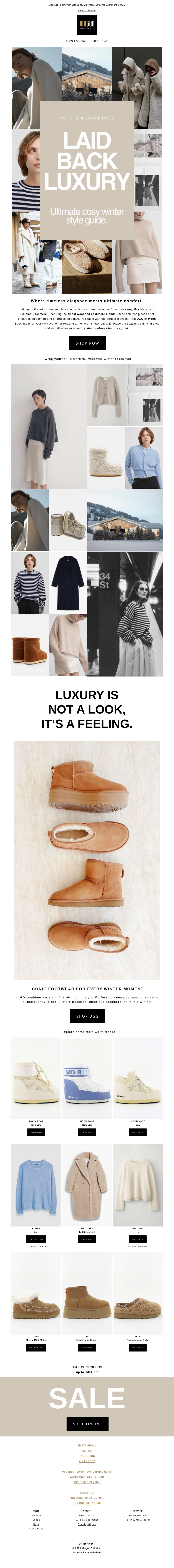 In deze nieuwsbrief laten we je kennismaken met de essentie van luxe die comfort omarmt. Verken stijlvolle kledingstukken die perfect passen bij de winterse sfeer en ontdek iconisch schoeisel voor elk moment. Kom meer te weten over hoe tijdloze elegantie samenkomt met ultiem comfort.
